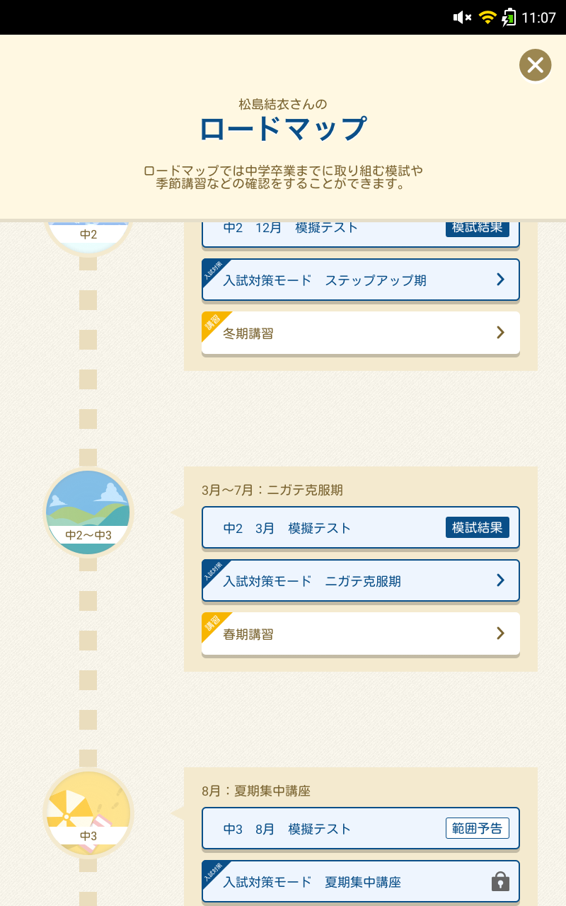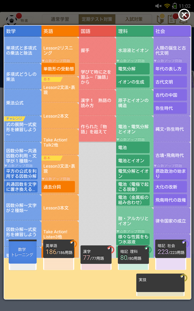 画面表示もわかりやすいから、自分が苦手にしている分野とか、先に押さえておきたい範囲とか、「あ、これをやろう」とすぐに選べて、迷わずに勉強を進められるんです。テストまでの残り日数や目標講座数が表示されるのも、計画的に勉強できて便利でした。
