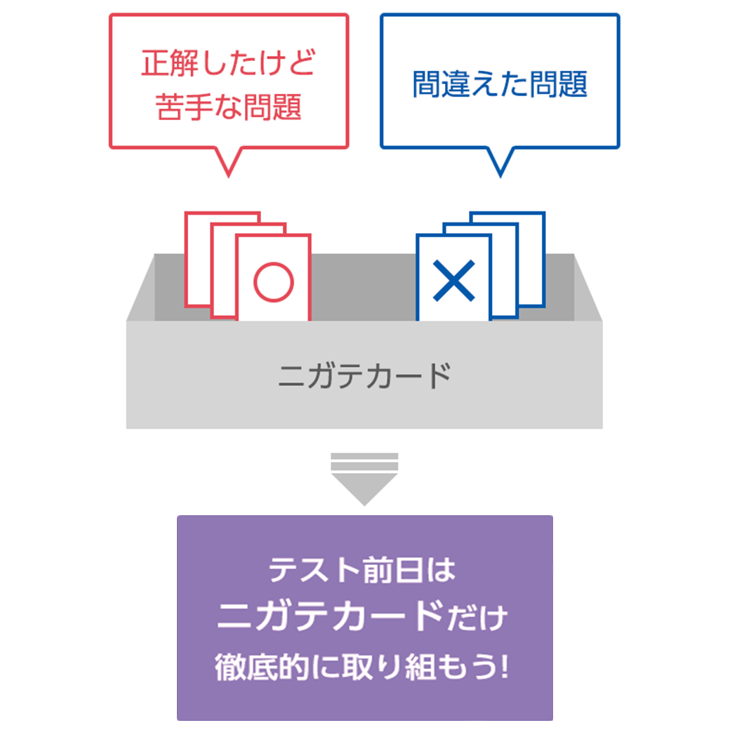 あと、暗記カードに「ニガテカード」ってあるじゃないですか。間違えた問題とかだけじゃなくて、自分で苦手だなって思う問題をチェックできるので、ニガテカードに溜めて、テスト前日には全部できるようにしました。