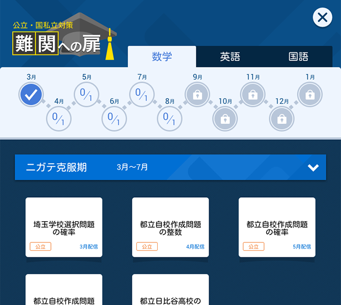 スマイルゼミは入試対策もオーダーメイド型。一人ひとりの学力レベルを単元ごとに判定し、今の実力と志望校とのレベル差を埋めていく対策問題を一人ひとりにあわせて配信。志望校合格に向けて着実に力をつけられます。