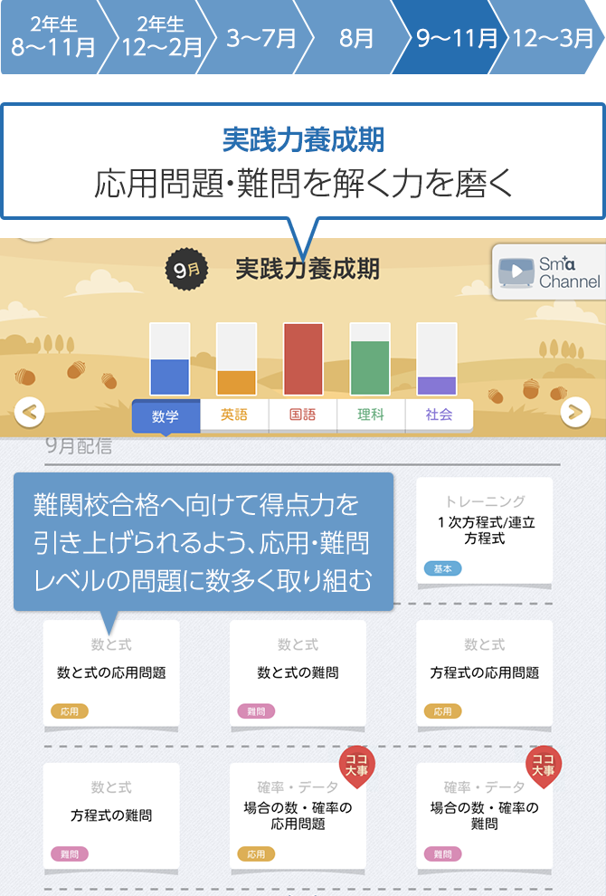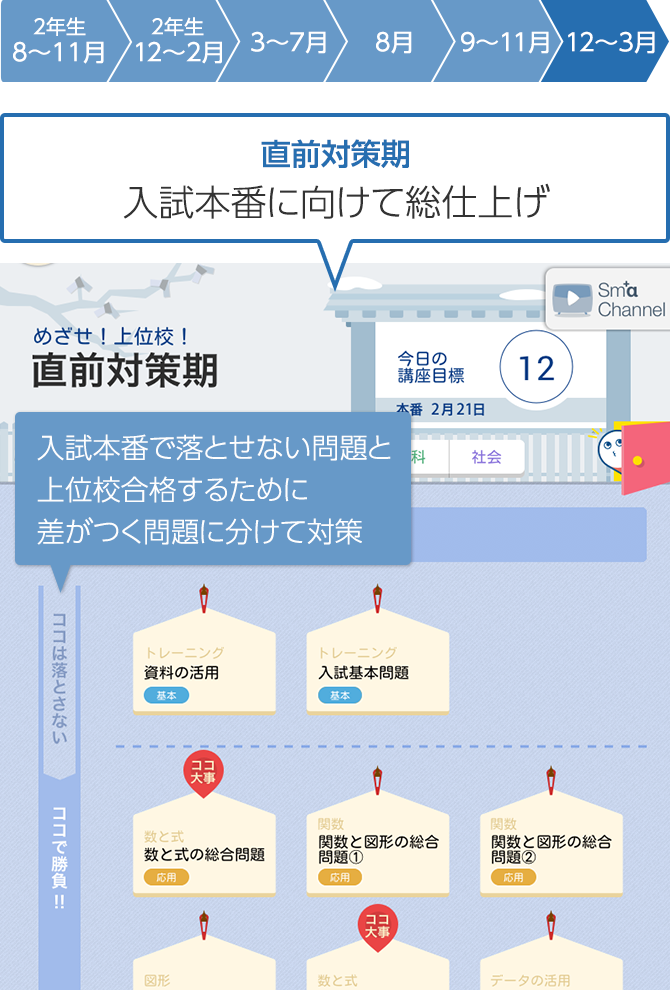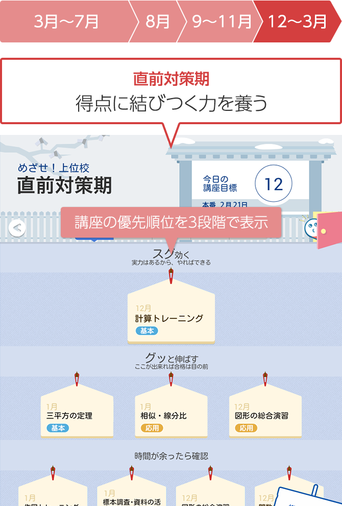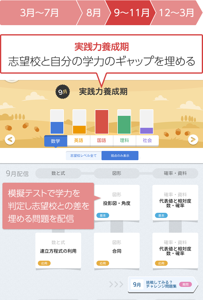 スマイルゼミは、入試対策も“ジブン専用”。定期的に模擬テストを実施し、一人ひとりの学力レベルを判定。専用の対策講座で今の実力と志望校とのレベル差を丁寧に埋めていきます。