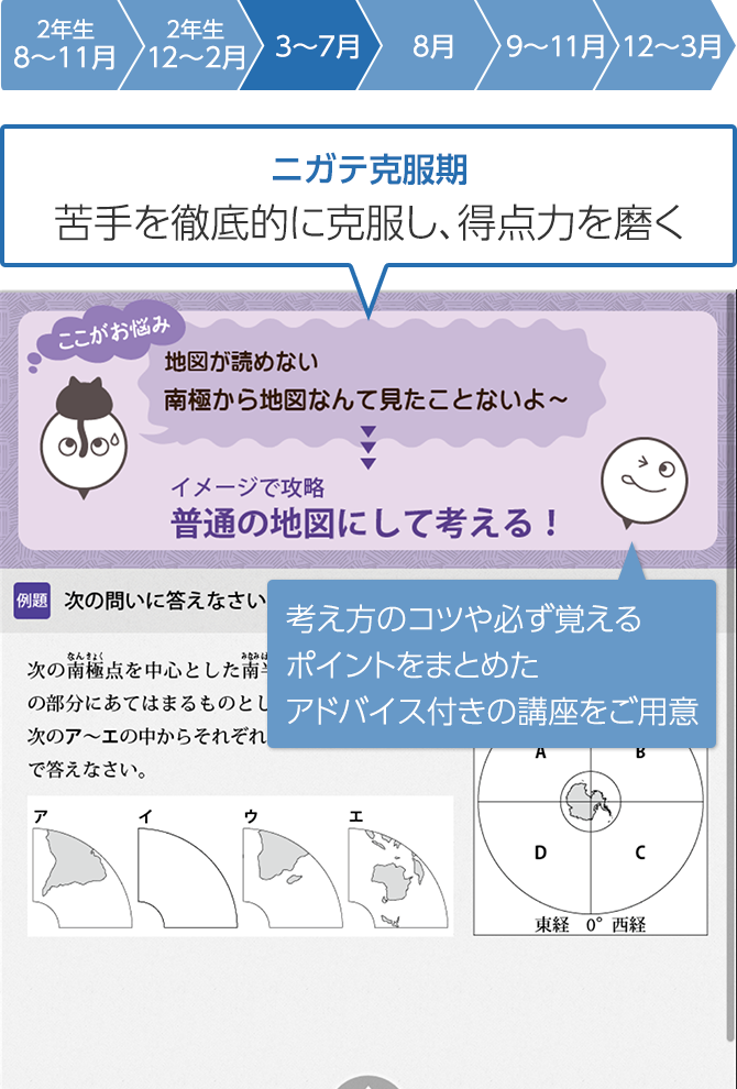 特進クラスでは、2年生8月から入試対策が開始。入試スタートダッシュ期から直前対策期までの6つの期に分け、そのときどきで必要な対策が行えるようにナビゲートします。