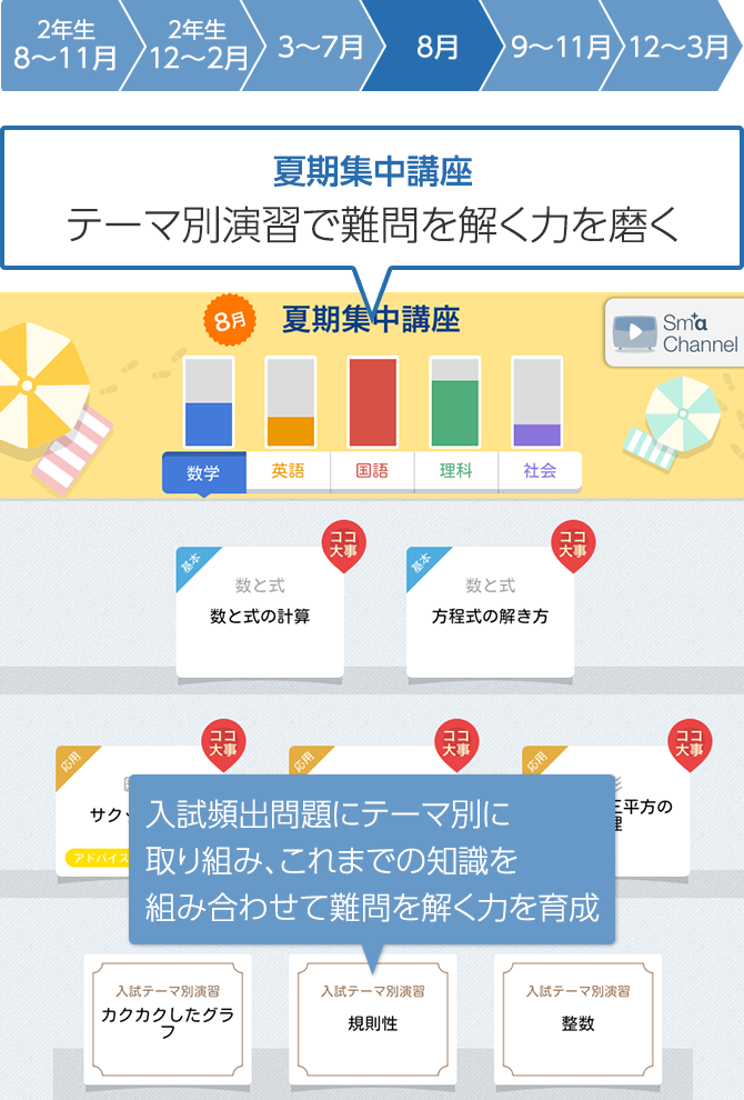難関公立・国私立高校合格に向けた専用の対策講座を2年生3月より配信。難関校と言われる学校の過去問に数多く取り組むことで実践力を高めます。