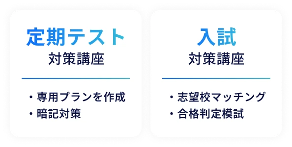 「英語コミュニケーションⅠⅡⅢ」「言語文化(古文・漢文)」の教科書に準拠。一部対応していない作品・教科書があります。1年生・2年生は「通常講座」「定期テスト対策講座」、3年生は「定期テスト対策講座」で教科書準拠の教材に取り組むことができます。2027年度以降発行の教科書対応教材は順次追加予定です。