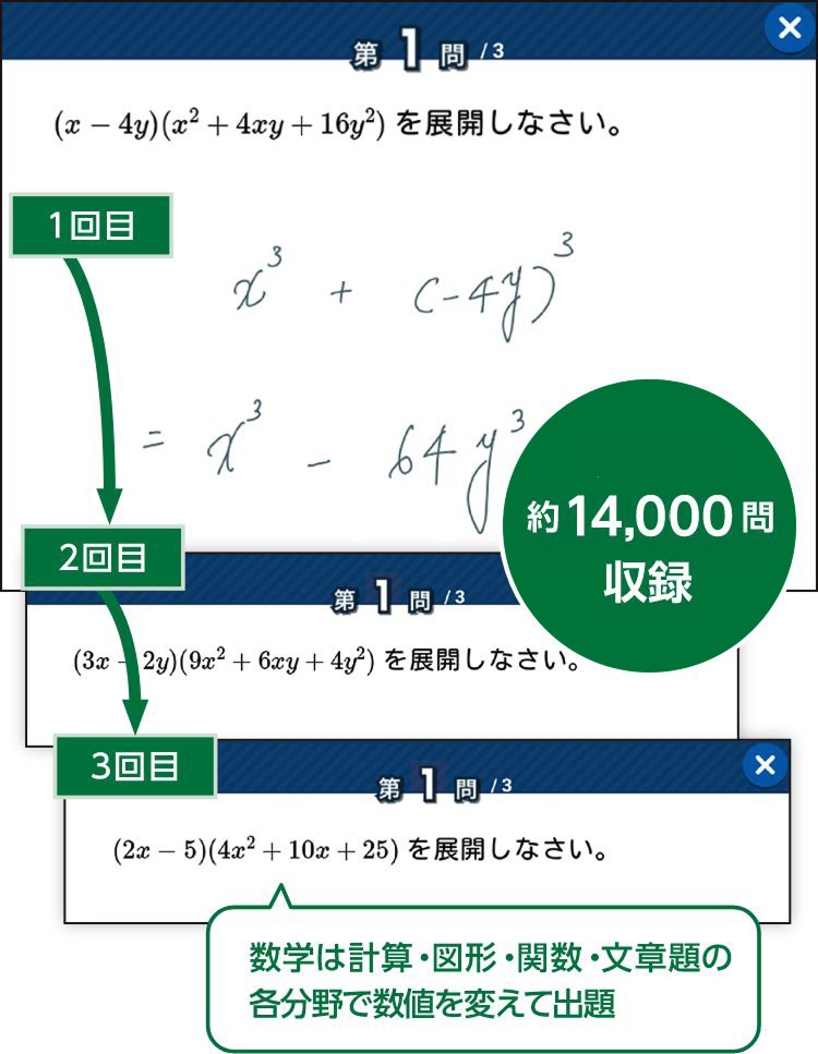 間違えた問題は覚えるまで何度も出てくるうえ、選択問題は位置が入れ替わります。「なんとなく覚えた」で終わらせません。
