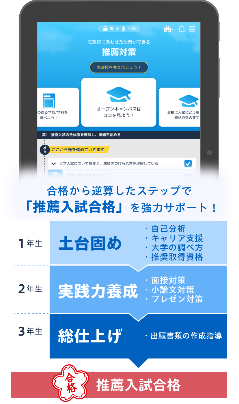 単元ごとの理解度に合わせた難易度の講座を出題。実力を志望大学レベルまで引き上げます。
