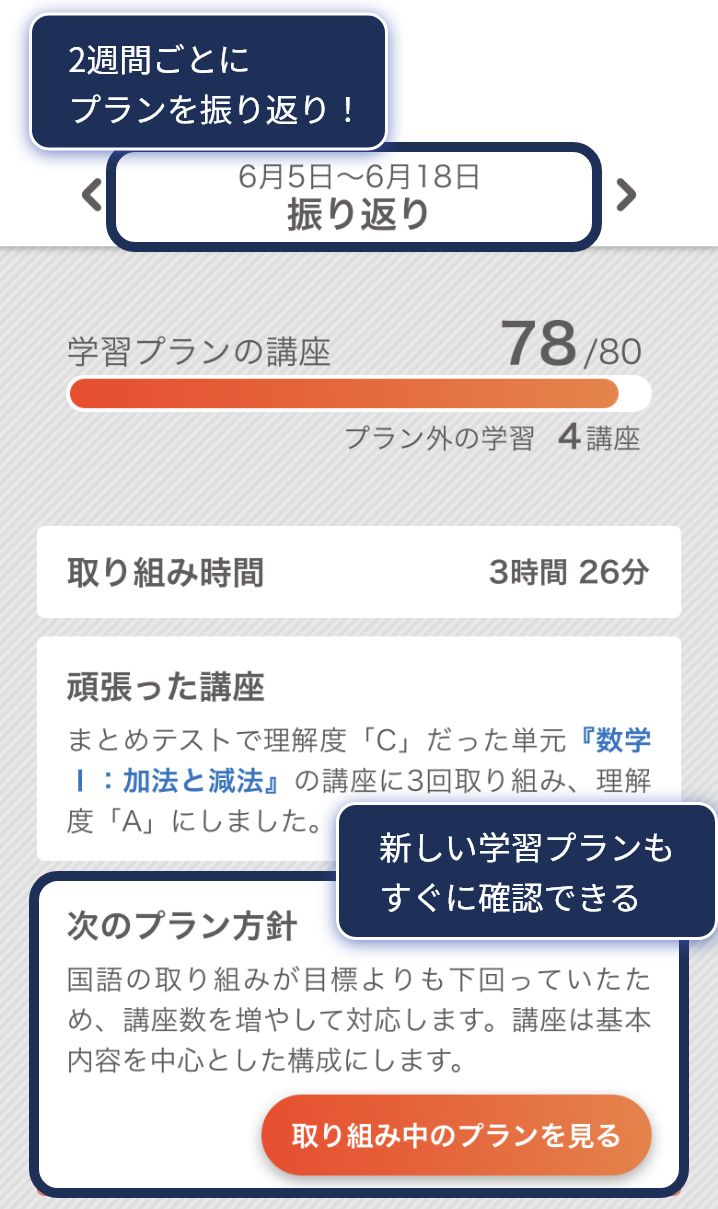 学校の宿題や部活動で忙しくても大丈夫。授業の予習復習を中心に、小さなつまずきを残さず、理解を積み重ねられるようにナビゲートします。