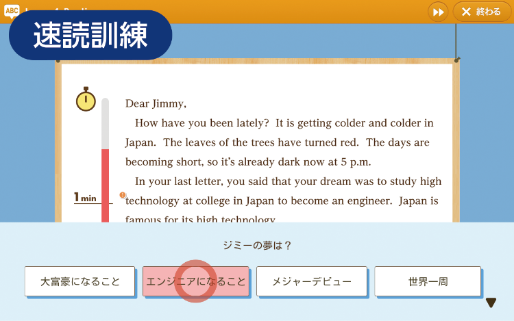 スマイルゼミ 英語プレミアムは、英検®合格を目指すオプション講座です。 1ヶ月あたり¥2,980~ (税込¥3,278~) 聞く、話す、読む、書く 4技能を伸ばす 「聞く」「話す」「読む」「書く」の4技能に対応し、基礎からしっかり伸ばします。 ハイブリッド型英検®対策 基本レベルから英検®レベルまで、最短5か月で習得できるカリキュラムを配信しています。 各級問題数 1,500問以上を配信 英検®によく出る表現を中心に、各級問題数1,500問~2,000問たっぷり配信します。