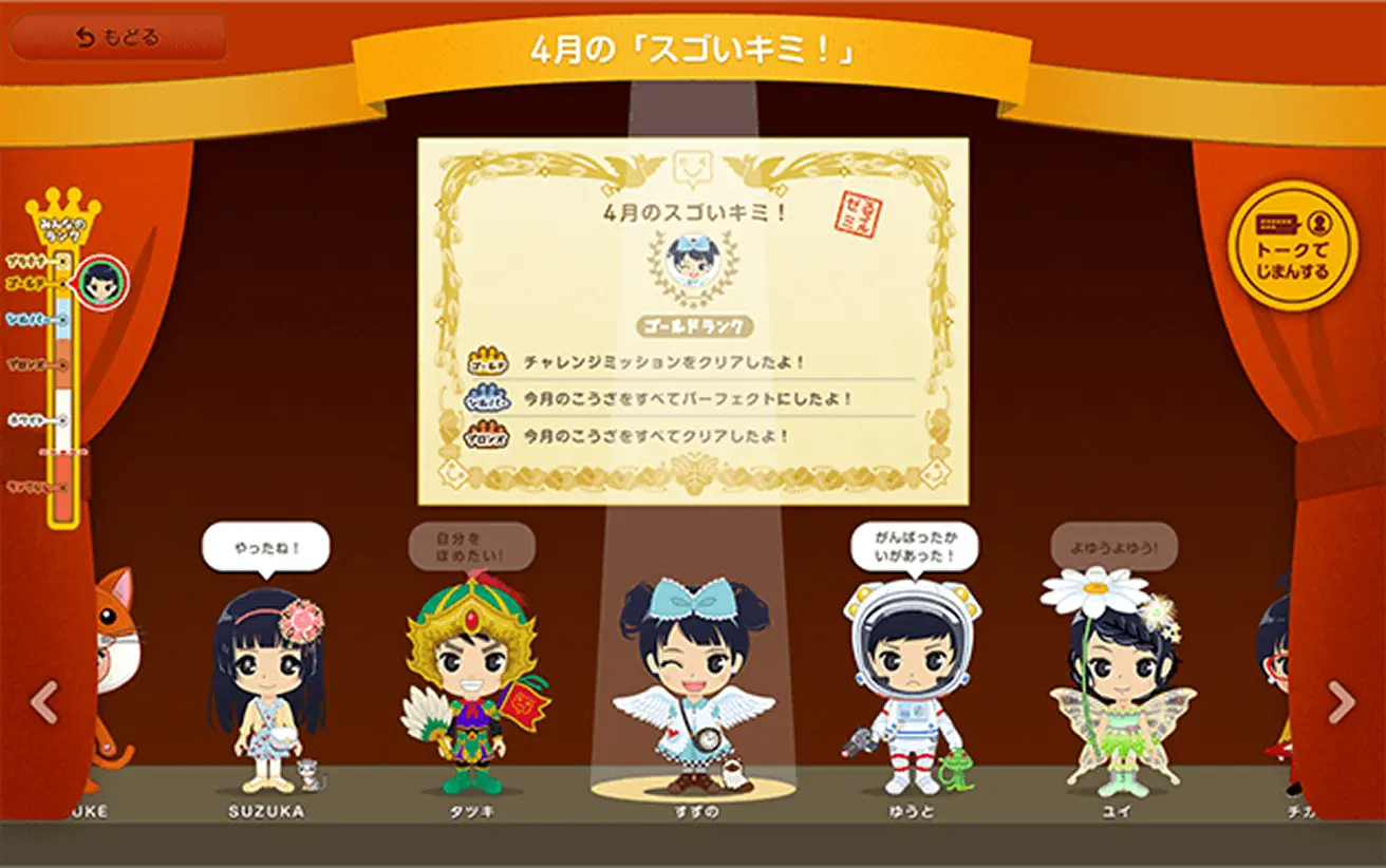 「きょうのミッション」を毎日クリアしていくとがんばりが認められて「すごいキミ!」に選ばれ、全国のスマイル会員の前で毎月表彰されます。