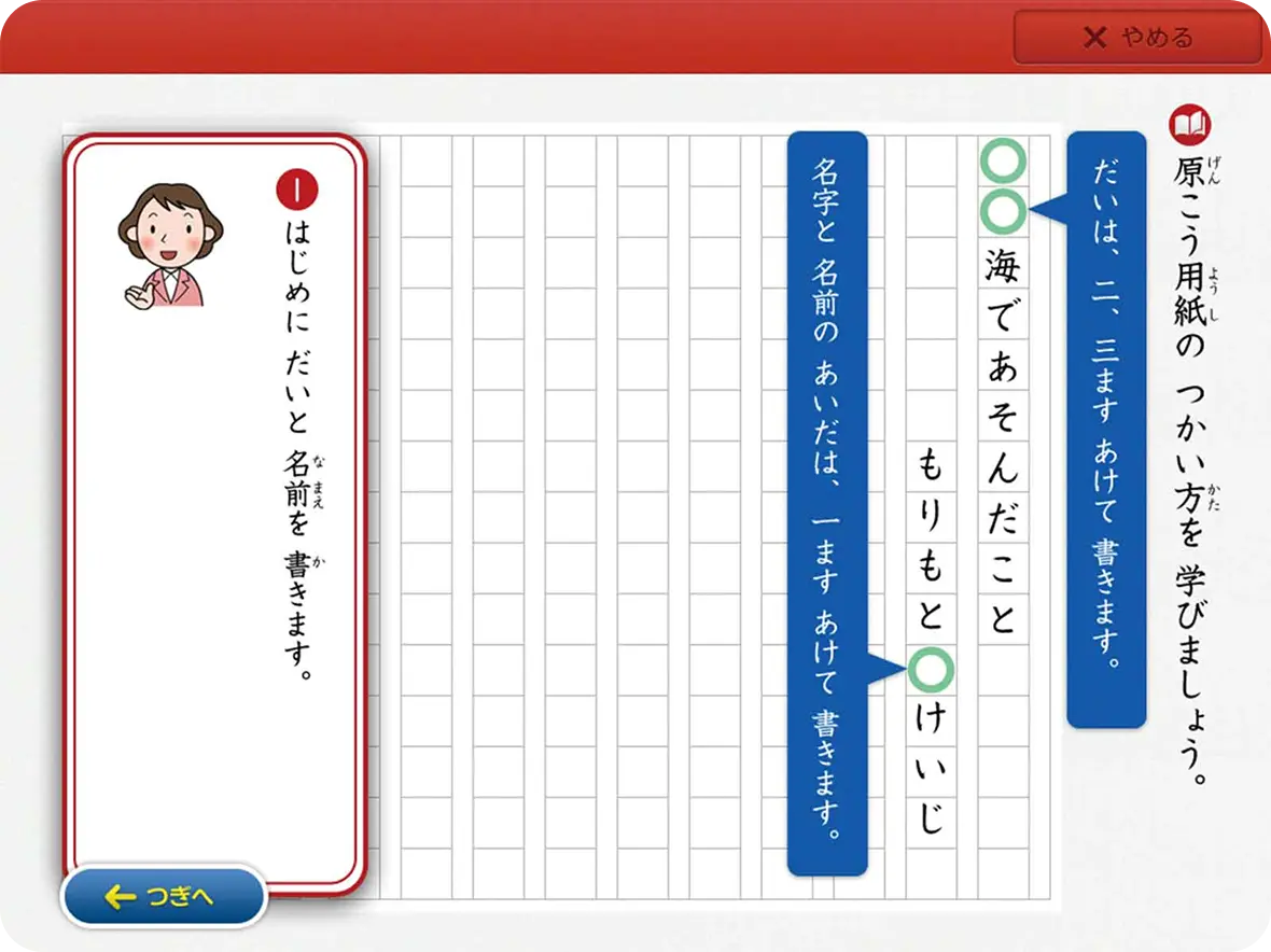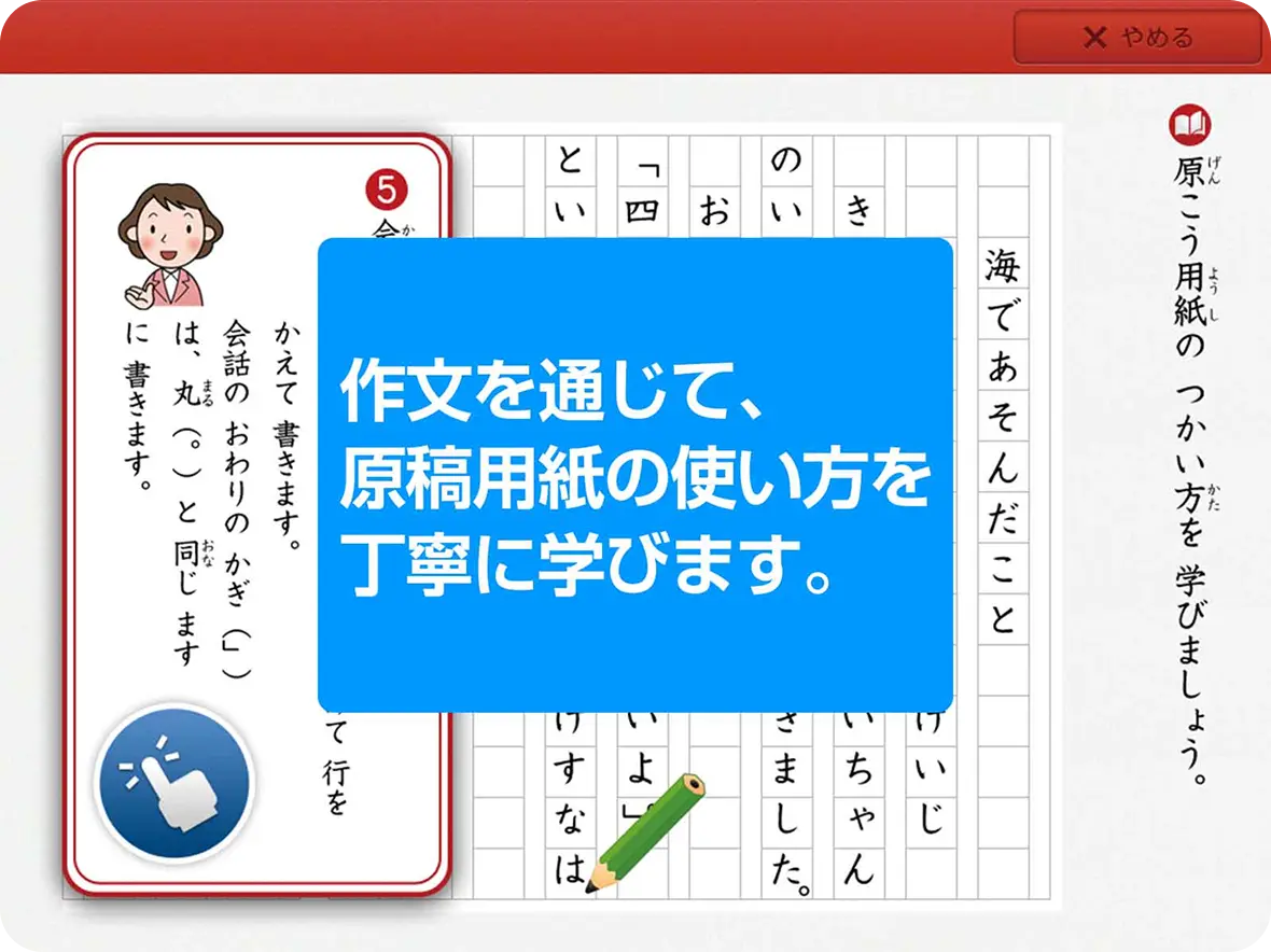 お⼿本を聞いて、⾃分で読んで、書いてを繰り返し練習することで、今後の学習の基礎となる「九九」の理解を深めます。