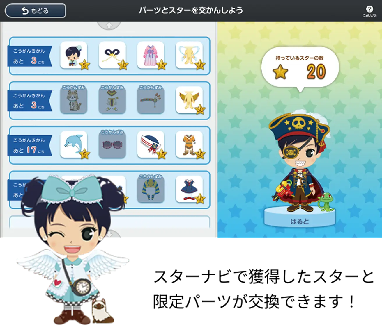 「マイキャラ」は、表彰や教材、ミニゲームなどさまざまに登場します。