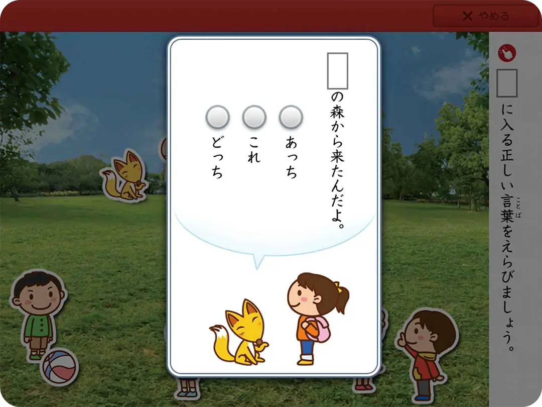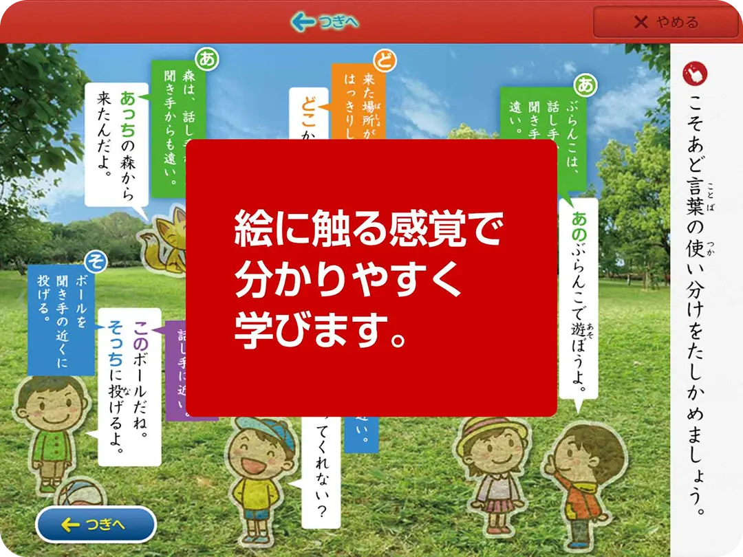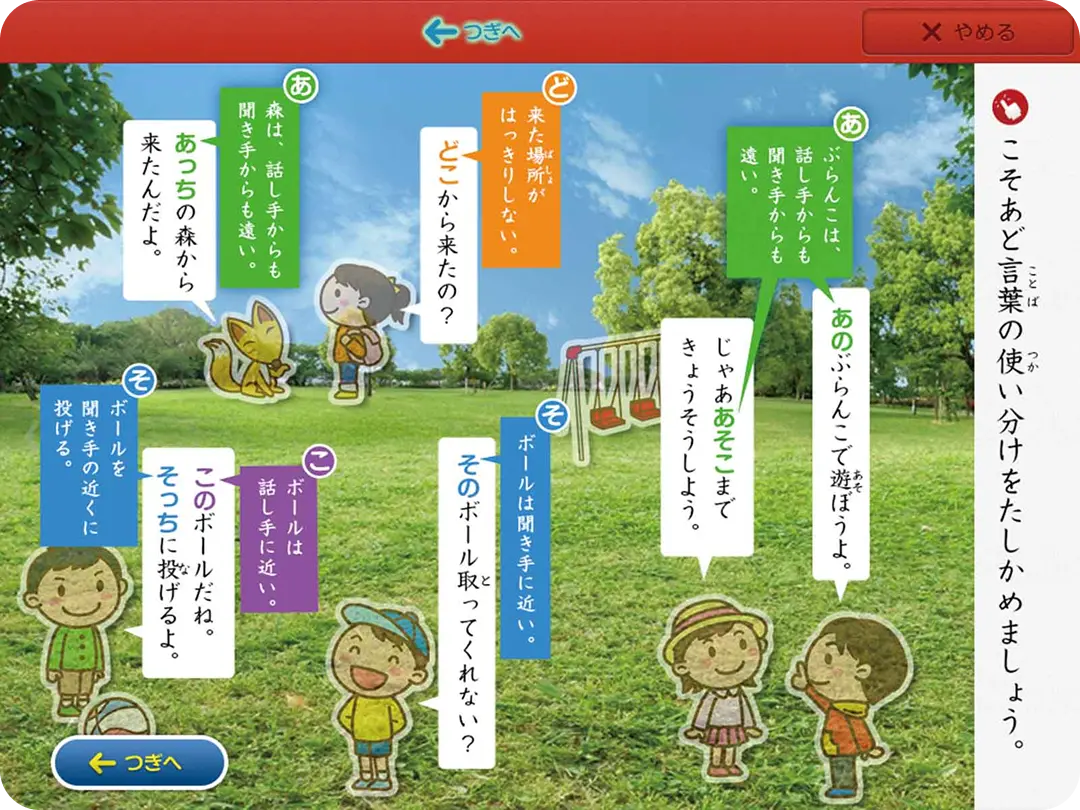 「こそあど言葉」の種類や、それぞれの持つ意味・役割を、動きのある見せ方やイラストでわかりやすく解説。こそあど言葉の指し示す内容がしっかり読み取れるようなります。