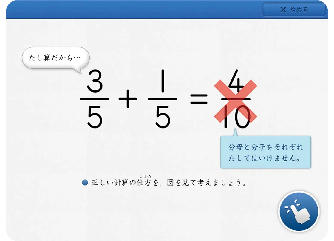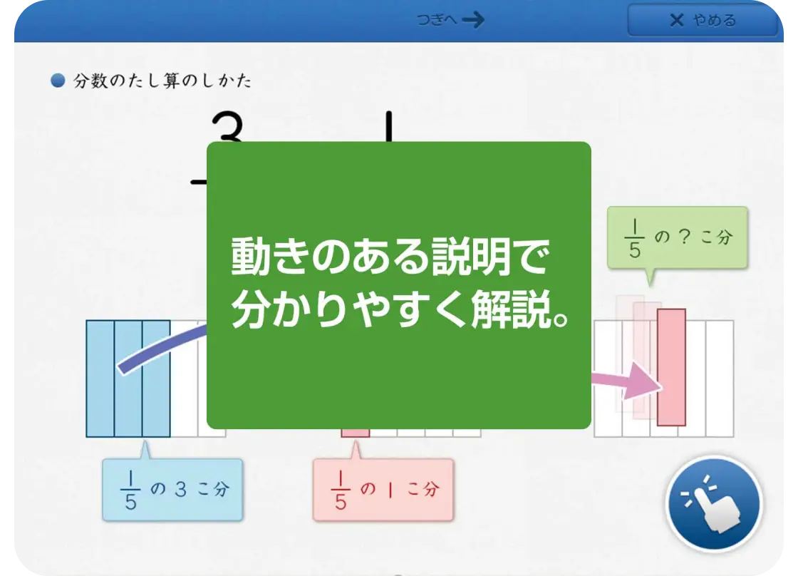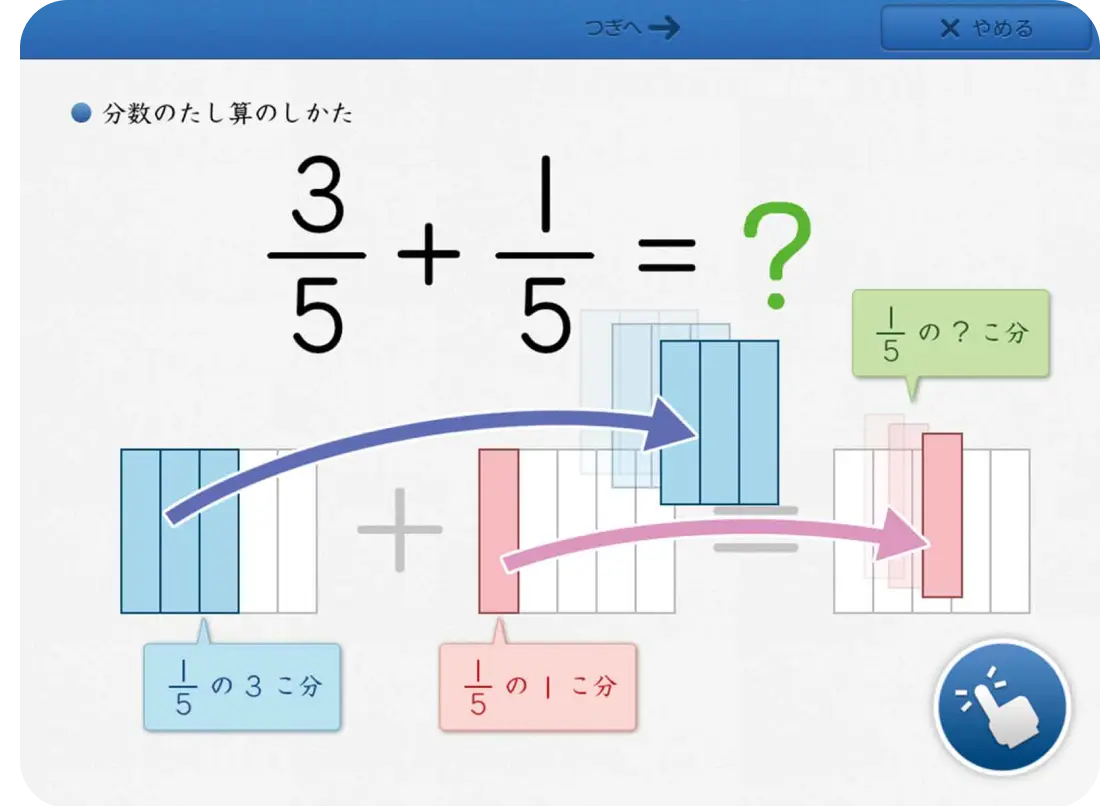 分数のたし算の考え方を、動きを伴いながら一つひとつ順を追って説明していくことで、視覚的に学ぶことができます。