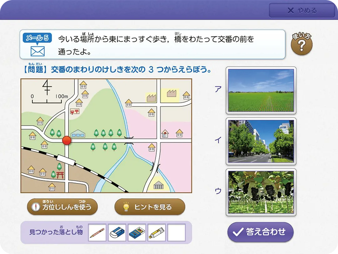落とし物を捜しながら地図の読み方を理解するワークや、地図記号を覚えるゲーム形式の要点チェックなど、楽しみながら、正しく地図を読み取る力を身につけます。