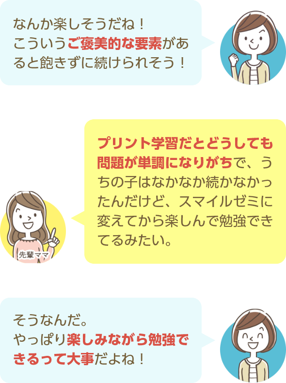 「みまもるトーク」は、仕事の合間や帰宅途中でもスマートフォンからお子さまの頑張りを褒めてあげることができます。 |