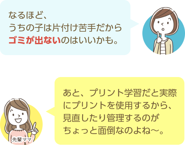 紙教材や個別添削不要で消しゴムのカスも出ません。学習内容も保護者はスマホで確認可能です。 |