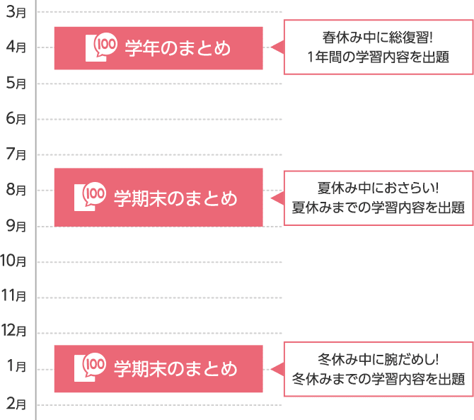 テストは学年・学期が終わった後の長期休みのタイミングで年3回実施。その期間中に学習した単元の得意・不得意のチェックと対策講座を行うので、次の学期・学年に苦手を持ち越しません。