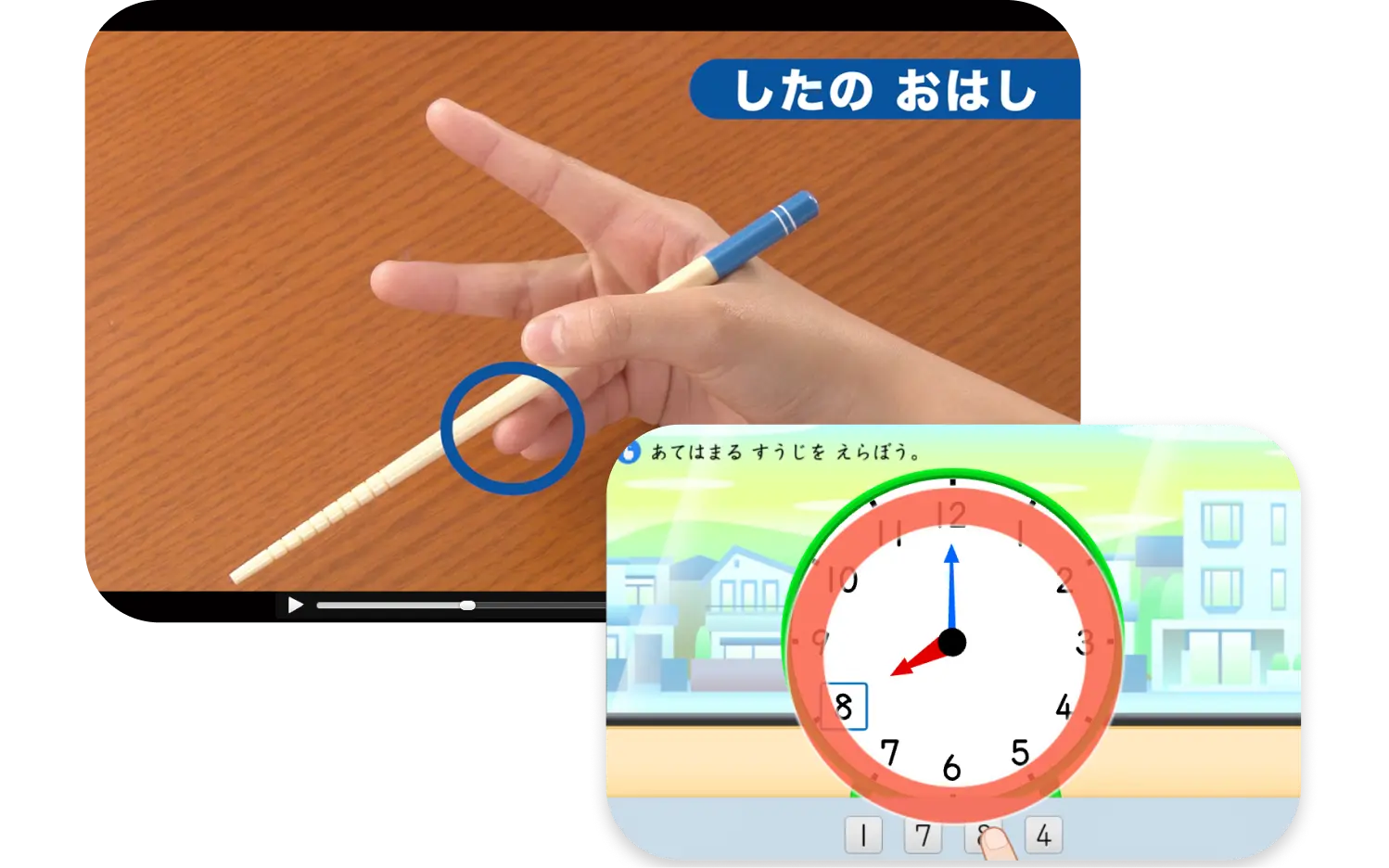 時計に慣れることから始め、時計の文字盤と数字の関係、7時や8時といった正時の読み方を段階的に学習していきます。