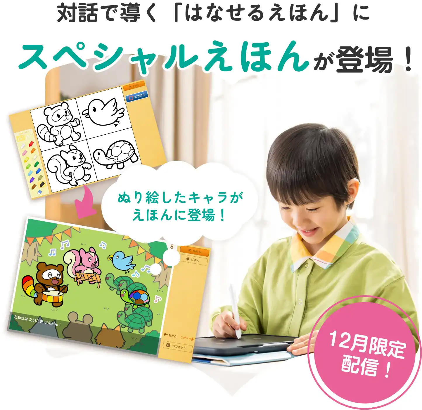 絵本の内容に沿ってタブレットがお子さまに問いかけ。自分で考え・答えることで、自然と語彙力や文章力が身につきます。
